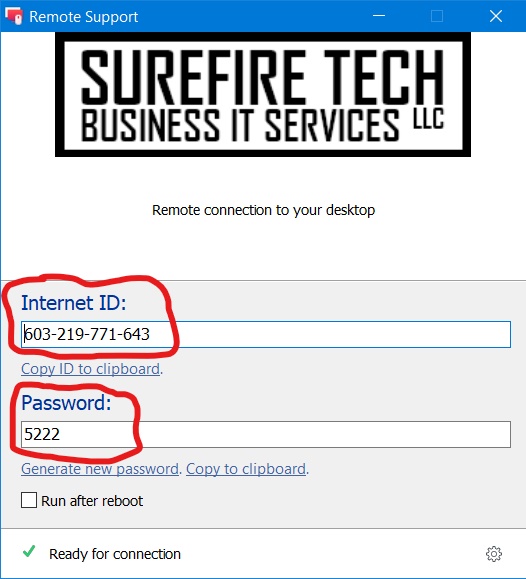 In order to use Surefire Tech LLC Remote Support, you must have a working Internet connection. You will also need to download a small piece of software that allows our technicians to connect to your computer in order to complete the work. To get started, click on the "Download Remote Support" button below. Once you've downloaded and run the program you should see a window like the one pictured below. We will need your Internet-ID and Password. If you've already have a Remote Support appointment set up, you can call, text or email us this information. If you haven't set up an appointment, please contact us to do so.